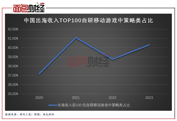 近年来,策略类产品一直是国内游戏公司海外创收主力,2020年至2023年,出海收入前100位自研移动游戏中策略类占比均超过35%。