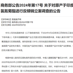 5月7日,国家商务部官网,正式发布《关于对原产于印度的进口氯氰菊酯进行反倾销立案调查的公告》(下称“调查公告”),商务部决定自2024年5月7日起,对原产于印度的进口氯氰菊酯进行反倾销立案调查。
