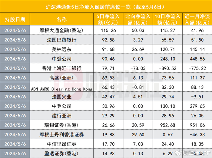 choice数据显示,截至5月6日,摩根大通金融(香港)沪深港通近5日净流入额最多的席位,达115.26亿元,法国巴黎银行、美林远东等机构席位近5日净流入额也超过90亿元。5月6日单日,摩根大通金融(香港)、摩根士丹利香港证券、美林远东、瑞银证券(香港)等席位的北向资金净流入额居前,其中摩根大通金融(香港)的净流入额达50亿元。