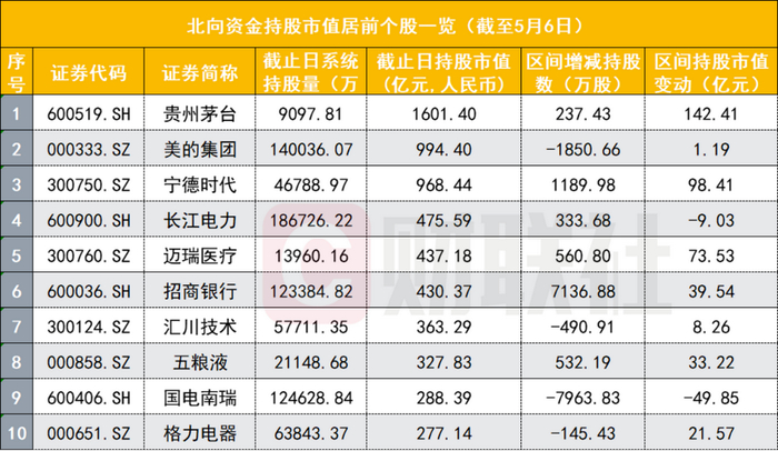 北向资金的再度回流,加仓的方向也成为市场的聚焦点。Wind数据显示,截至5月6日,贵州茅台是北向资金持股市值最高的个股,达1601.4亿元。该股年内被北向资金增持超460万股,其中,自4月下旬以来的增持股数已达到237.43万股,占比超五成。