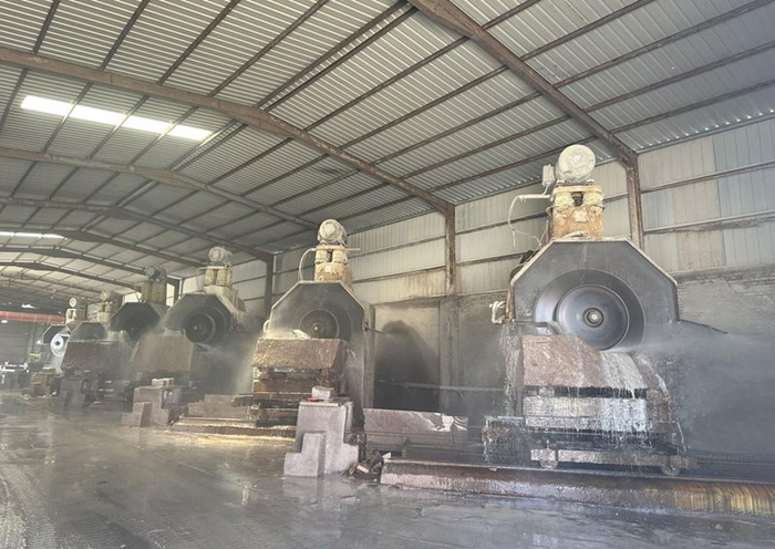 在瓜州县盛辉石业有限责任公司车间内,工人们忙着进行大切、磨板、切边等工作,现场一派火热的生产场景。