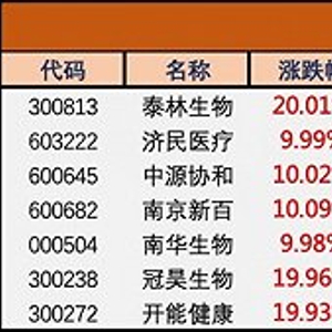 5月8日,干细胞概念大面积涨停,冠昊生物(300238)、开能健康(300272)、泰林生物(300813)、中源协和(600645)、济民医疗(603222)、南京新百(600682)、南华生物(000504)等多股涨停;贝瑞基因(000710)、和元生物(688238)等跟涨。
