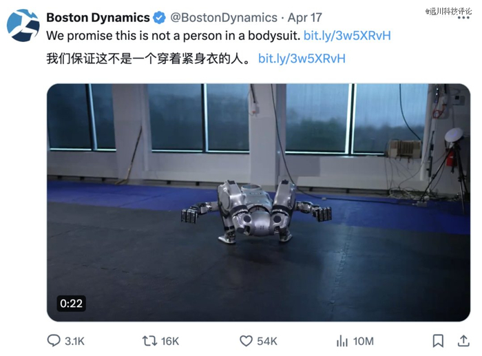 波士顿动力也在推特上阴阳怪气了一句:“我们保证这不是一个穿着紧身衣的人。”