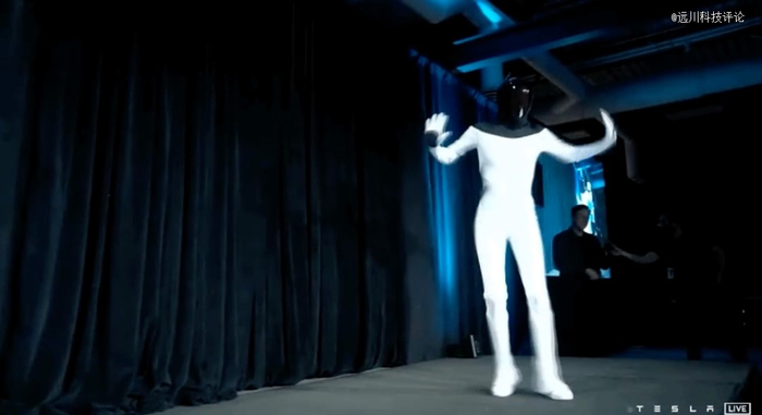 也许是担心在场观众干看PPT无聊,马斯克请来了一位身着紧身衣的皮套人,模仿Tesla Bot尬舞了一段。