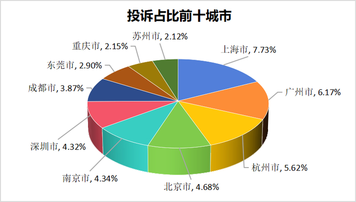 另外,从地域来看,投诉主要集中在上海、广州、杭州、北京等一线城市,其中上海成为投诉数量最多的城市,共计1,004条投诉,占据了全部投诉数量的7.73%。其次入榜前五的城市分别为广州市、杭州市、北京市以及南京市,投诉总量占据了全部投诉的28%。