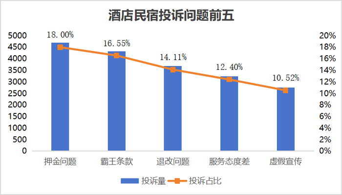 这三类问题加起来几乎占据了整个行业投诉总量的50%,这意味着,通过有效解决这三个方面的投诉,酒店民宿行业有望减少将近一半的投诉量。另外,服务态度差,虚假宣传也入榜前五。