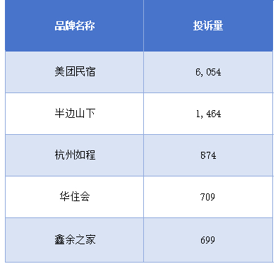 其中,美团民宿以6054条高居榜首,占总投诉量的44.07%;其次为半边山下,共1464条,占了10.66%。另外杭州如程、华住会及鑫余之家也入榜投诉前五,被投诉数量分别为:874、709、699。