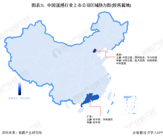 目前,中国遥感行业的上市公司基本分布在北京和广东地区。在北京地区,产业链上游环节的企业包括雷科防务、华力创通,中游环节的企业包括航天宏图、四维图新、中科星图,还有同时布局在上游和中游环节的中国卫星。在广东地区,航宇微同时布局在产业链的上游和中游环节,海格通信则是产业链上游环节的企业。