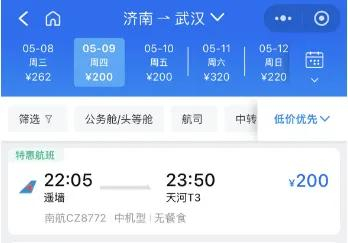5月9日济南飞武汉的最低机票价仅200元,回来的价格同样只需要200元。