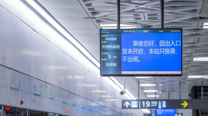 “各位乘客,本次列车的终点站天府站到了,请带好随身物品下车,前往天府机场北方向的乘客请换乘后续列车……”