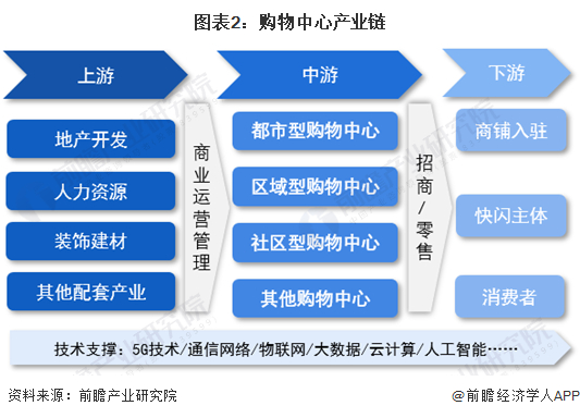 购物中心产业链相对简单,上游是地产开发、建材装饰、人力资源以及其他配套产业。中游是各类型的购物中心,例如都市型、区域型、社区型等;下游面对的是商铺和消费者,有时候购物中心的部分空闲场地还可以留给临时的节日活动和快闪活动来增加短期收入。
