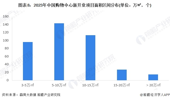 2023年新开项目3-5万平方米体量区间占比超20%,数量为96个,5~10万平方米区间数量在143个,占比最高,达36%,但同比2022年有所下滑;10~15万平方米区间的项目数量为113个,占比近3年连续上升,从2021年、2022年、2023年分别为7%、16%、29%。