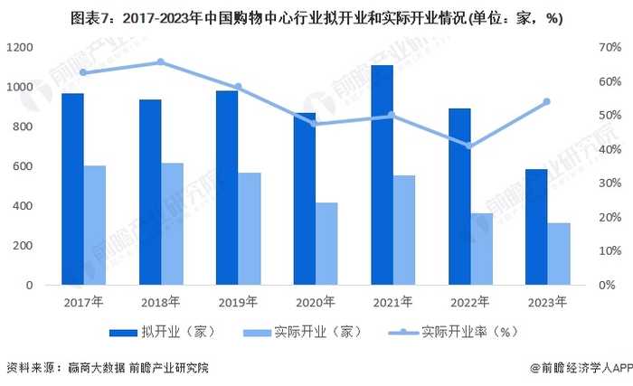 据赢商大数据统计,2017-2023年,全国拟开业购物中心从970家下降至488家,2023年创下2017年以来拟开业量新低,仅最高峰的2021年拟开业的一半。实际开业呈波动趋势,2023年实际开业数量317家。拟开业率从2017年62.5%波动下降至2022年最低值41%,再回升至2023年的54%,体现出购物中心主体对项目更加慎重的落地步伐,同时轻资产的运作模式缩短了商业运作周期,提高了实际开业率。