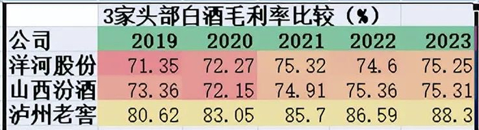 在白酒TOP5公司中,除了贵州茅台,泸州老窖的毛利率一直高于其他4家。这一点,在3家竞品的财报数据上,看得非常清楚。2019-2023年间,洋河股份与山西汾酒的毛利率一直相差不大,都在75%上下徘徊。