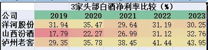 财报显示,2019-2023年间,洋河股份的净利率一直保持在30%左右山西汾酒、泸州老窖的净利率,则是连续4年增长。