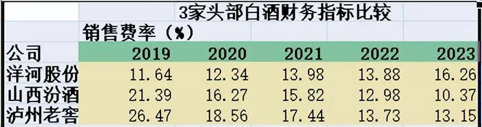 2023年,洋河股份销售费率16.26%,反过来高于山西汾酒的10.37%,泸州老窖的13.15%。