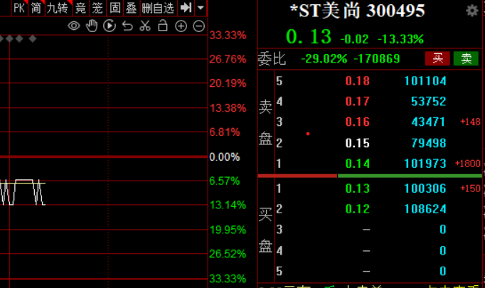 5月8日下午,*ST美尚的卖1、买1、买2价位,分别有10万手的大单压盘和接盘。该股在0.14元时,与上一交易日的0.15元收盘价只下跌了1分钱,但跌幅已高达6.67%,跌2分钱,跌幅就为13.33%。