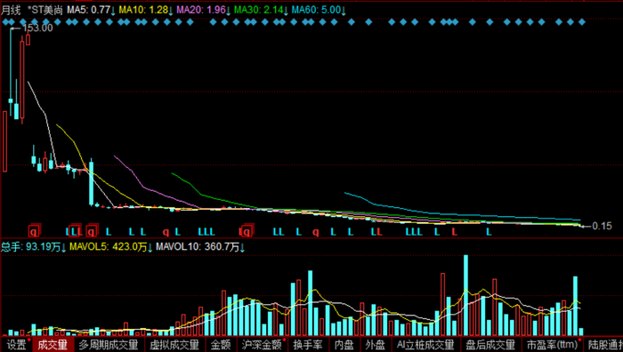 *ST美尚月K线图,其最高价为153元,2024年5月7日的收盘价为0.15元,为沪深股市最低。