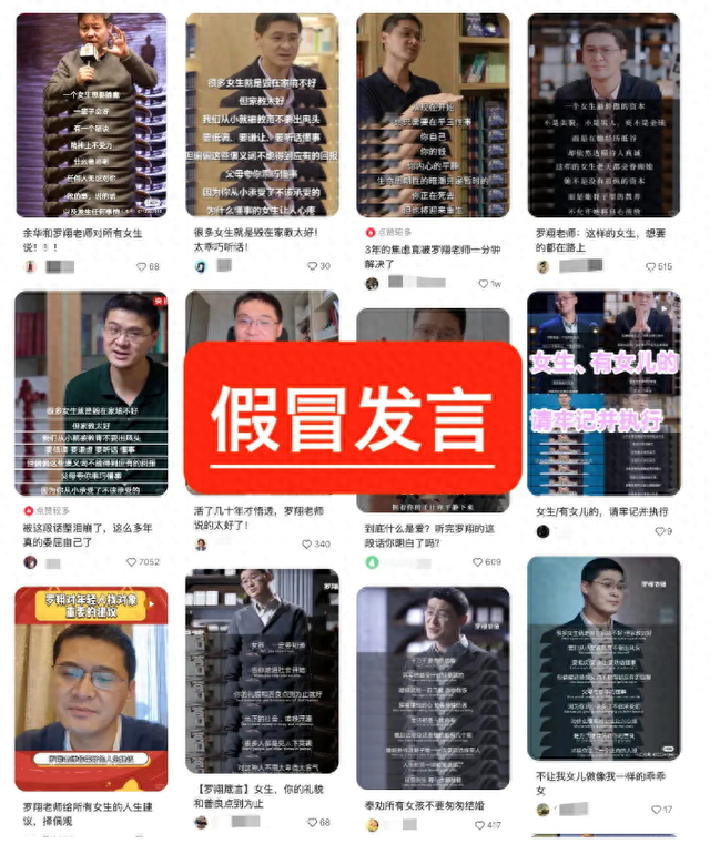 更让罗翔感到郁闷的是还有人打着他的名义去招摇撞骗,“有人说是我助理,接受他人案件咨询,收取高额咨询费。有人用我的名义和人谈人生、谈哲学,甚至还有谈恋爱的,前几天还有人质问我为什么和女生撩骚,说我和一个女生聊天聊到深夜,网上还和男生对骂。感觉我都成AI了。”伪造的罗翔发言已经超出一般的“灌鸡汤”程度,在一些社会事件中,还有自媒体冒充“罗翔评价”来对社会事件发出议论,社交平台上还有多个类似罗翔本人社交账号的账户,对此罗翔声明“本人一直使用并更新的社交媒体仅有‘罗翔说刑法’B站号、公众号和喜马拉雅,其他社交媒体早已停更多年。非常感谢。”