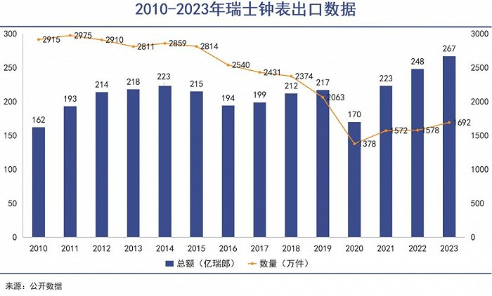 瑞士手表的出口金额却呈现一个稳步上升的曲线,从2010年的162亿瑞士法郎,攀升至2023年267亿瑞士法郎。
