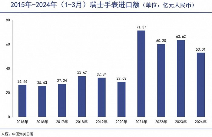根据中国海关总署数据来看,2024年前三个月瑞士手表的进口额,已经迅速回落到2021年以前的水平。