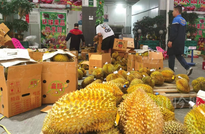 “今年五一小长假很多顾客来购买榴莲,每天销量在400多件。”环球果品批发部老板韦丽暖说,“五一”前一个星期榴莲已大量上市,为了更好把控榴莲价格和质量,去年开始她承包了泰国的榴莲果园销量,从二级分销商跃级成为一级分销商。目前她从泰国发回4柜的榴莲,每柜有900多件,每件超15公斤,由于“五一”销量很好,她现在已做好从泰国发货的计划。
