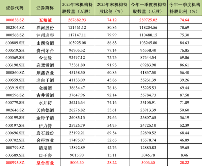 事实上,今年一季度,有18家上市酒企均被机构股东不同程度上减持。申万宏源指出,2024年将是白酒板块预期和估值的修复之年,行业整体需求短期仍有压力。