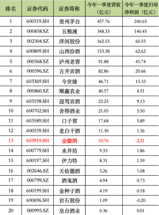 金徽酒在行业规模不算突出。2023年,金徽酒,实现营收25.48亿元,在20家上市酒企中排名15,归母净利润3.29亿元。今年一季度,金徽酒排名往前推进2名,实现营业收入10.76亿元,同比增长20.41%;归母净利润2.21亿元,同比增长21.58%。