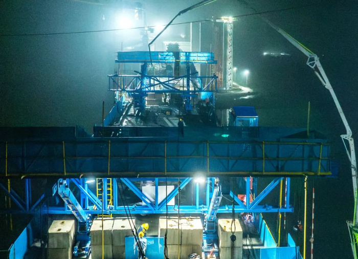 5月5日23时50分,在马鞍山市郑蒲港新区姥下河村建设现场,随着最后一方混凝土浇筑入模,标志着新建巢湖至马鞍山城际铁路(以下简称巢马城际铁路)郑蒲港三号桥双48米连续梁顺利合龙。至此,巢马城际铁路江北段架梁通道贯通,为后续架梁、马鞍山长江公铁大桥公路引桥施工等奠定了坚实的基础。