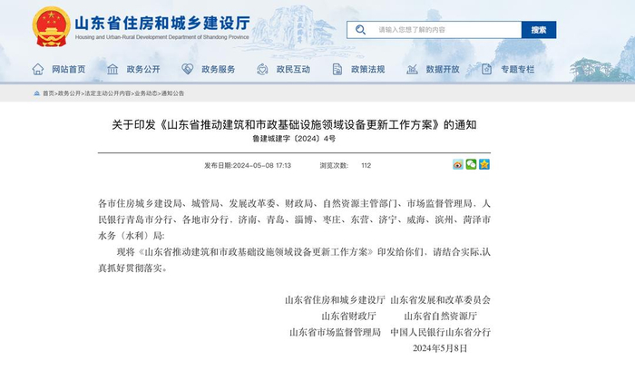 8日,山东省住房和城乡建设厅、山东省发展和改革委员会、山东省财政厅 、山东省自然资源厅 、山东省市场监督管理局 、中国人民银行山东省分行6部门联合印发《山东省推动建筑和市政基础设施领域设备更新工作方案》(后简称《方案》)。《方案》明确,今年全省加装既有住宅电梯1500部,更新(改造、大修)住宅老旧电梯2000部以上,2027年全省建筑和市政基础设施领域设备投资规模较2023年增长28%以上。