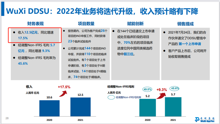 在过往的“Fast Follow”大浪潮中,药明康德提供的小分子IND数量和获得临床试验批件的小分子数量均保持高位,这让DDSU业务一度成为药明康德的业绩增长点之一。根据财报,在2018年,药明康德的DDSU业务部门为国内客户递交了27个小分子创新药的临床申请工作,其中17个项目的临床试验获得了批件。到了2021年,药明康德累计完成144个项目的IND申报工作,并获得110个项目的临床试验批件,该业务收入规模已经达到12.5亿元。