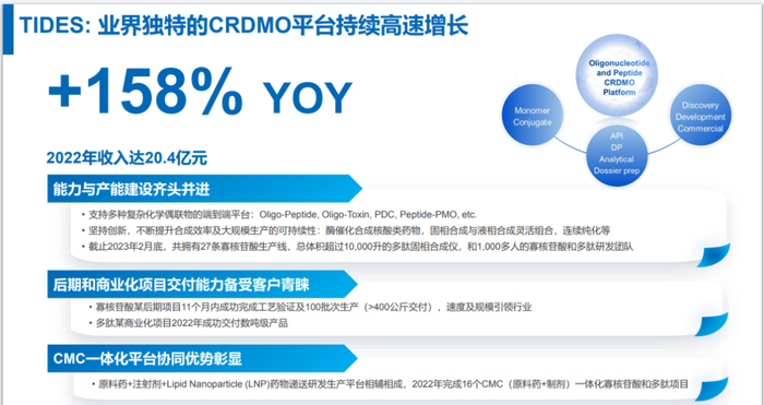 在药明康德2022年的财报中,TIDES业务被首次提及,并报告了显著的收入增长。TIDES在2022年的收入达到20.37亿元,同比增长158.3%。截至2023年末,药明康德TIDES在手订单同比显著增长226%;服务客户数量140个,同比提升36%;收入达到34亿元,同比强劲增长64.4%。