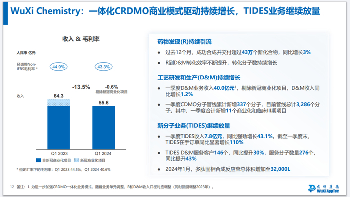 到了2024年,药明康德的TIDES业务仍在继续放量。截至2024年第一季度末,TIDES在手订单同比显著增长110%。同时,TIDES D&M服务的客户数量达到146个,同比提升30%,服务分子数量达到276个,同比提升43%;收入达到7.8亿元,同比强劲增长43.1%。
