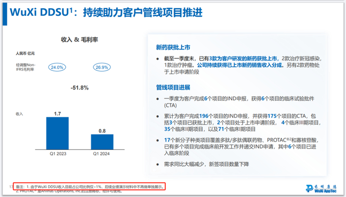 截至2024年第一季度末,药明康德为客户研发的3款新药已获批上市,其中2款为治疗新冠感染新药,1款为治疗肿瘤新药,已持续收到新药销售收入分成。另外还有2款药物处于上市申请阶段,后续会持续为药明康德提供收入。不过,药明康德已经预期到DDSU业务的下滑趋势,并表示:由于WuXi DDSU收入目前占公司比例仅1%,后续业绩演示材料中不再做单独展示。因此,药明康德以后新药获批上市后的销售收入分成基本可以忽略。