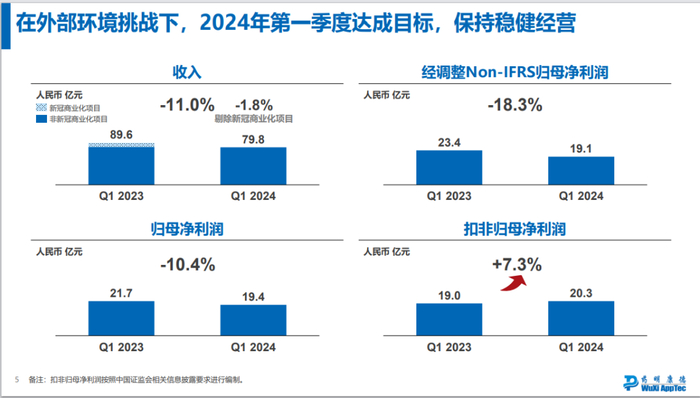 TIDES业务的持续放量,虽然给药明康德带来了新的业绩增长点,但全球医药产业链动荡仍是药明康德面临的主要议题,也成为其未来发展中的关键不确定因素所在。自今年1月底起,药明康德卷入美国生物安全法案风波。药明康德多次强调,其在过去没有、现在和未来都不会对美国或任何其他国家构成国家安全风险。不过,从2024年一季报可以看到,药明康德来自美国客户的收入49亿元,剔除特定商业化生产项目后同比增长0.4%,仍然保持在稳定状态。