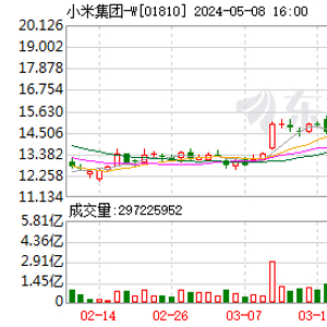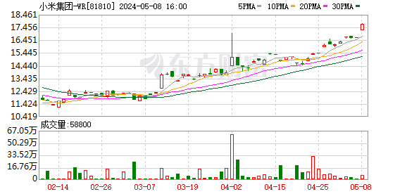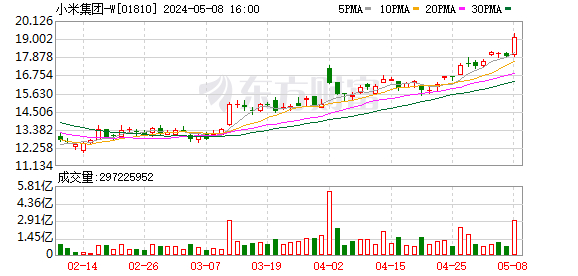 5月8日,小米集团股价逆市大涨,截至收盘上涨6.47%,报19.1港元/股,市值达4766亿港元。