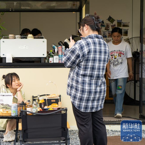 5月7日,顾客在潜山市南北咖啡馆室外区域拍照。新华社记者 赵金正 摄