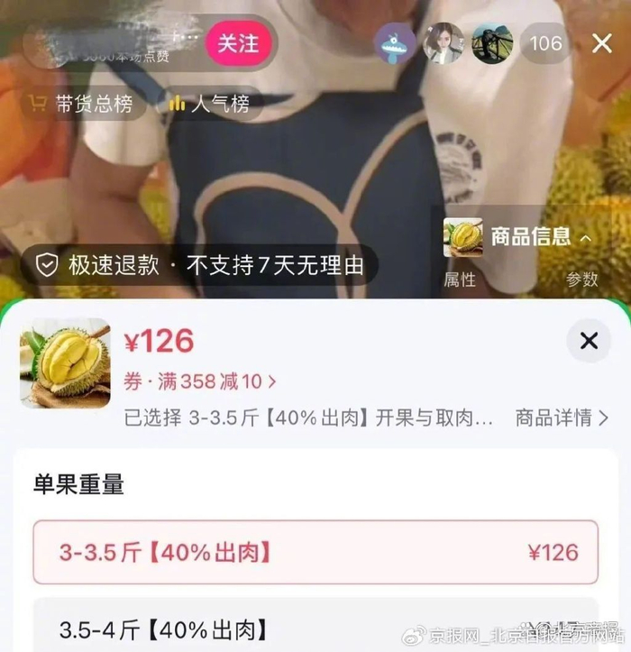 在线上渠道,商家也开启了直播开榴莲、互相比价的活动。在抖音平台,新发地市场一商家正在进行开果直播,店内3—3.5斤重的金枕榴莲售价为126元。据介绍,门店保证40%的出果率,果肉不足由门店补足。同时,消费者下单后门店将通过闪送配送,距离20公里内约一小时送达,吸引了不少消费者在线上下单。