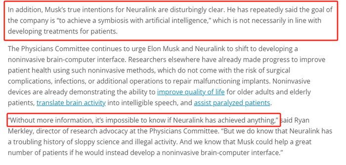 在动物伦理争议之外,不少人也对Neuralink的技术路径和马斯克的宏大愿景提出批评。负责任医生委员会认为,马斯克的目标是通过Neuralink的技术“实现与人工智能的共生”,这样的路径却并不一定和治疗患者的最佳方法相一致。此外,非侵入式的脑机接口已经证明在改善患者健康上取得了进展,Neuralink的开颅植入方法可能会带来不必要的风险。