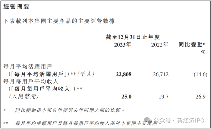 不难发现,2023年,映宇宙营业收入只增长了8%,但净利润却实现大翻盘,且净利润近4亿元。虽然财务数据表现亮眼,但运营数据却走了下坡路。根据年报披露,2023年,映宇宙的每月平均月活用户下降了14.6%,但每月每用户平均收入增长了26.9%。