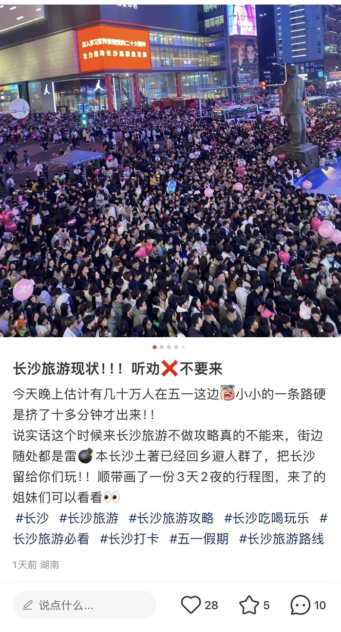 还有长沙的网友表示:“小小的一条路硬是挤了十多分钟才出来……本长沙土著已经回乡避人群了,把长沙留给你们玩!”