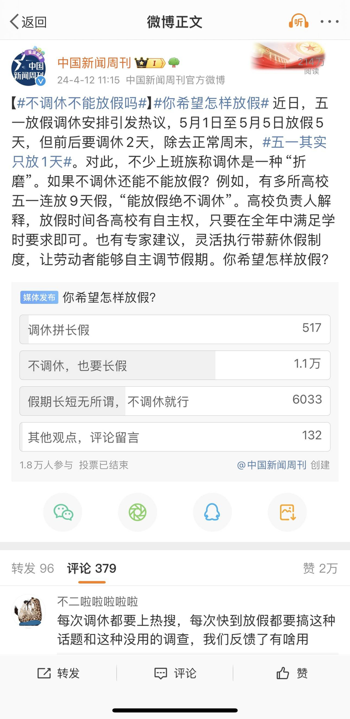 在中国新闻周刊官方微博4月12日发起的“你希望怎样放假?”的投票中,“不调休,也要长假”的选项票数最多,为1.1万票。