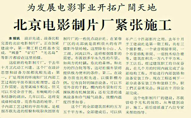 为了适应拍摄长故事片的要求,1956年1月,苏联派出设计专家协助北影厂规划新厂建设。新厂址选定安定门外小关,1959年建成时,全部建筑面积约5.5万平方米,是当时国内规模最大的电影制片厂,可以年产24部普通银幕和宽银幕影片。厂区内有环境优美的外景地,包括小山、人工湖、河流和一些半永久性的布景,比如南方的村镇、北方的四合院等。厂内建有三个摄影棚、一个录音剪接车间、一个布景修配车间和一座技术综合楼。摄影棚内有良好的隔音设备,棚内的布景和灯光操纵都有机械装置,还有完善的通风设备和冷气暖气设备。这座厂区从筹建到设计、施工,苏联前后曾派遣了八位专家来帮助指导。通过北影厂的建设,北影人也与苏联电影界建立起比较密切的联系。(1959年10月1日《北京日报》7版,《北京电影制片厂紧张施工》)