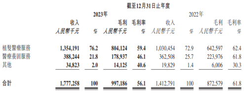 营收细化而言,2023年,雍禾医疗植发医疗服务业务实现营收为13.54亿元,上年同期为10.31亿元,同比增加31.4%;医疗养固服务业务实现营收为3.88亿,上年同期为3.63亿,同比增加7.1%。