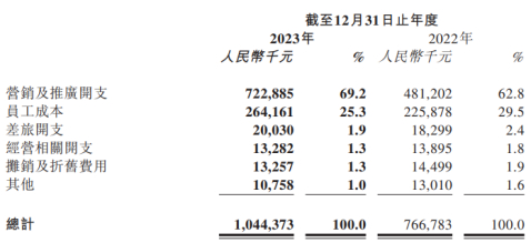 2023年,销售及营销开支细化而言,其中营销及推广开支为7.23亿,上年同期为4.81亿;员工成本为2.64亿,上年同期为2.26亿;差旅开支为2003万,上年同期为1829.9万。显然,在公司超10亿的销售及营销开支中,营销及推广开支占比近七成。