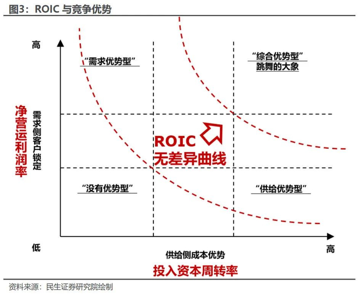 通过ROIC定量拆解企业竞争优势来源,分为供给侧优势型和需求侧优势型两种。ROIC等于NOPAT利润率乘以投入资本周转率。如果一家企业通过高NOPAT利润率实现高ROIC,应该将分析重点放在客户锁定上。如果公司的高回报来自高投资资本周转率,应该强调成本领先分析。