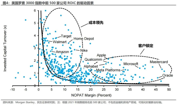 下图展示了罗素3000指数中前500家公司以及A股营收TTM前300家公司的ROIC驱动因素。实线黑色曲线是等收益投入曲线,代表了NOPAT利润率和投入资本周转率的组合,使ROIC达到百分之五。在右下方的公司,具有相对较高的利润率和低的投入资本周转率,追求需求优势客户锁定战略。而在左上方的企业,具有相对较低的利润率和高的投入资本周转率,力争成为供给优势成本领先者。