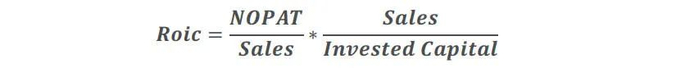 右侧第一项,NOPAT/销售额,是NOPAT税后净利润率,衡量了每单位销售的利润。第二项,销售额/投资资本,是投资资本周转率。这衡量了资本的效率。此公式说明公司可以通过不同的方式达到相同的ROIC。