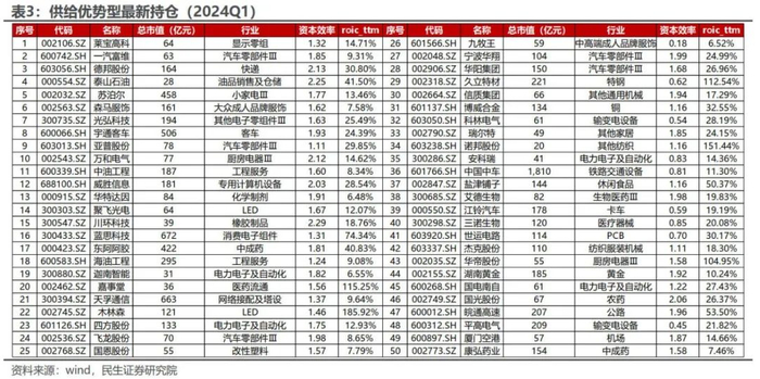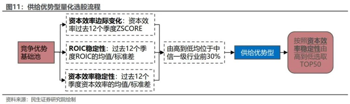 我们从竞争优势基础池中筛选出具有供给侧优势的个股。我们要求选取的个股在资本效率时序稳定性、资本效率边际变化和ROIC时序稳定性三个方面均位于中信一级行业内前70%,并首先选取资本效率时序稳定性最高的前50个个股。这样的选择逻辑是基于以下理由:我们希望选取具有相对较高ROIC的个股,并且高ROIC来自于供给侧,这意味着该公司具有供给侧优势。此外,我们还要求这种供给侧优势在边际上得到强化,这表明公司的“护城河”得到了维护和提升。