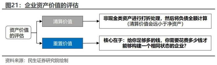 企业的资产价值AEV(Asset Enterprise Value)判断来源于资产负债表。一般来说,资产价值等于资产减去负债,但又不完全等同于资产负债表上的净资产(账面价值)。如果判断某个产业未来的存活能力值得怀疑,那么公司的资产和负债就应该根据清算价值进行计算。如果判断某个产业未来依然得以存活,那么公司的资产和负债就应该根据重置价值进行计算。